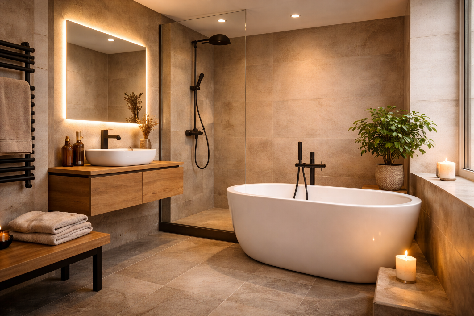 In combinatie met subtiele, indirecte verlichting zorgen deze materialen voor een ontspannen sfeer. De badkamer voelt minder “ruimte” en meer “plek”.